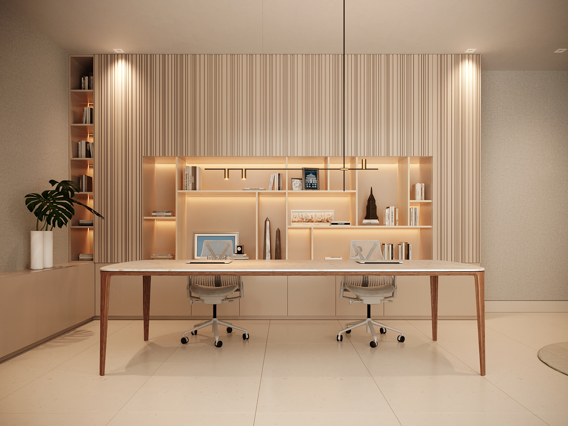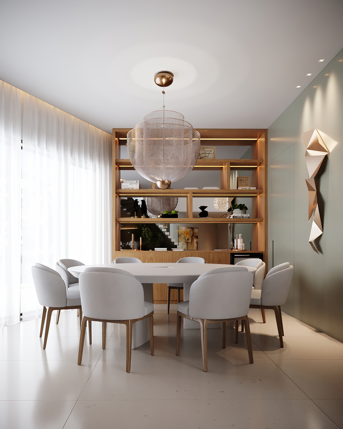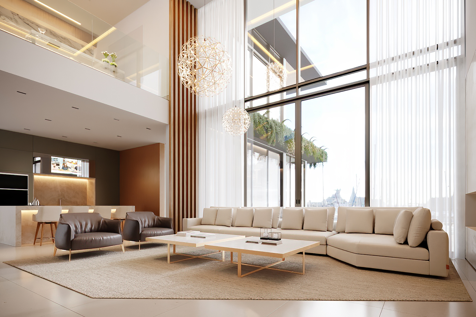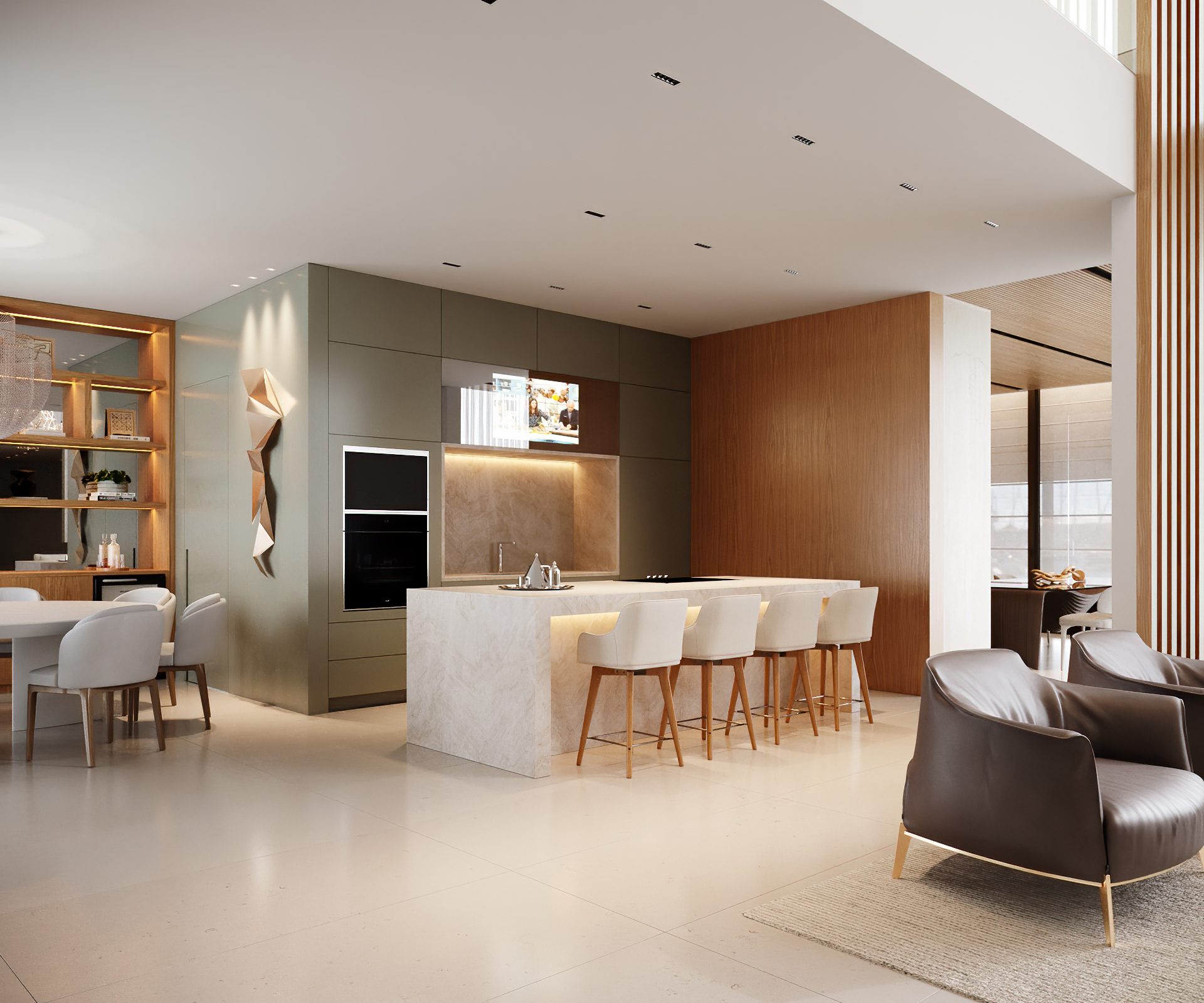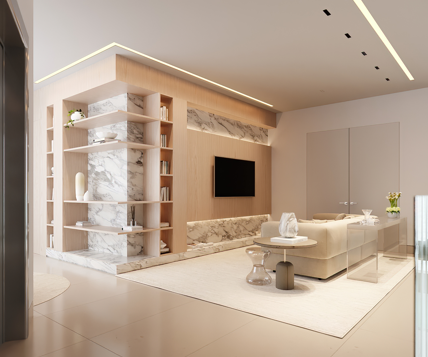 Experience modern living in our integrated living, dining, and family room design. A wooden niche enhances openness, while light tones create a sense of space. Vibrant hues in the family room add a contemporary touch, revitalizing the apartment with modern elegance.