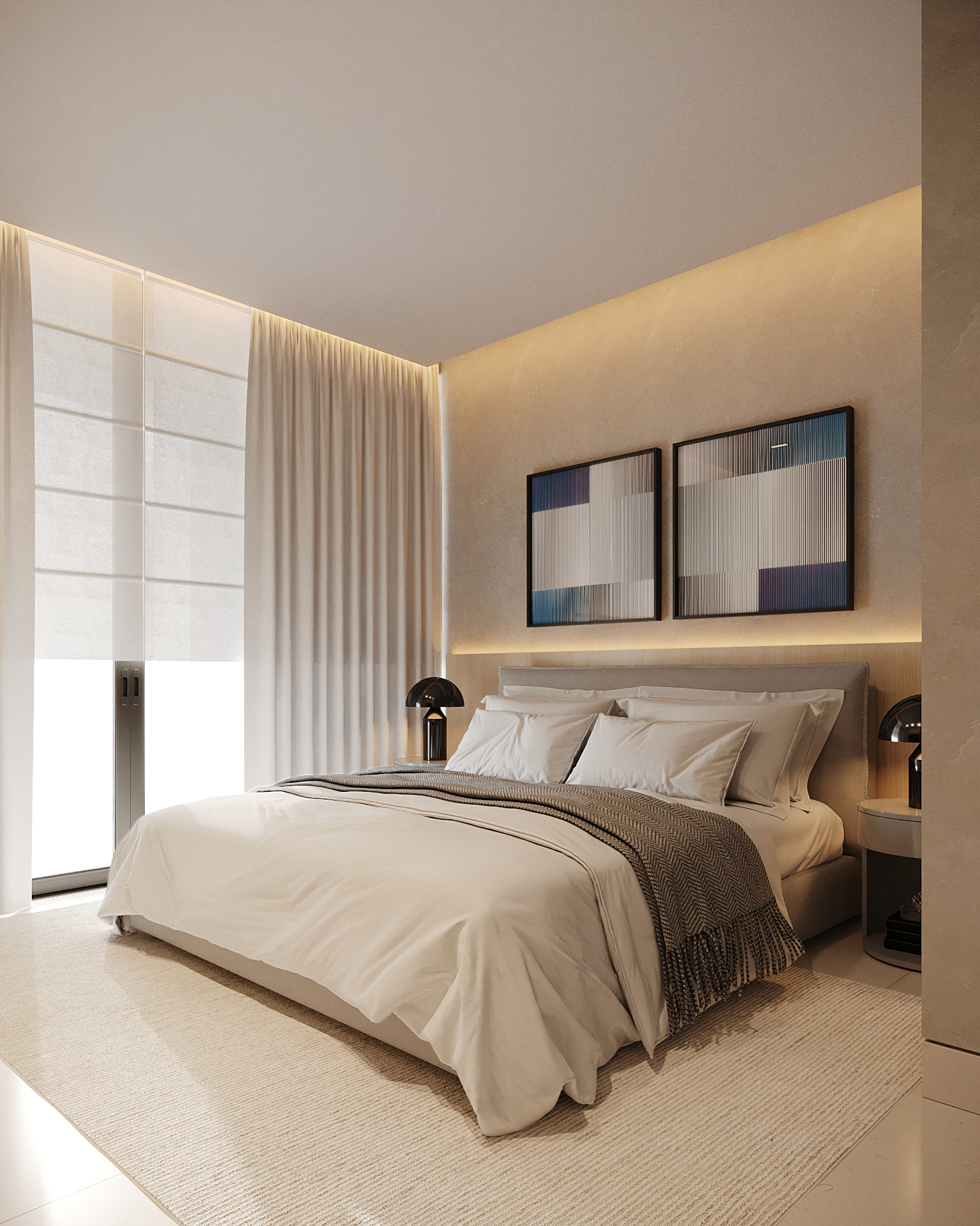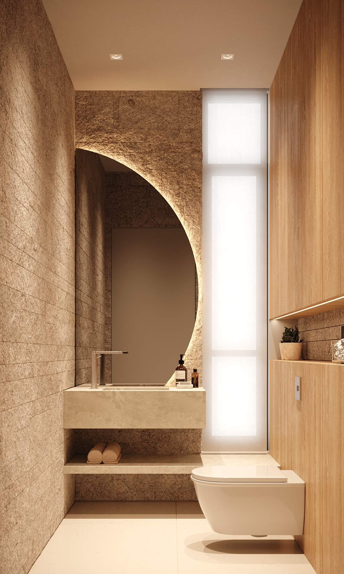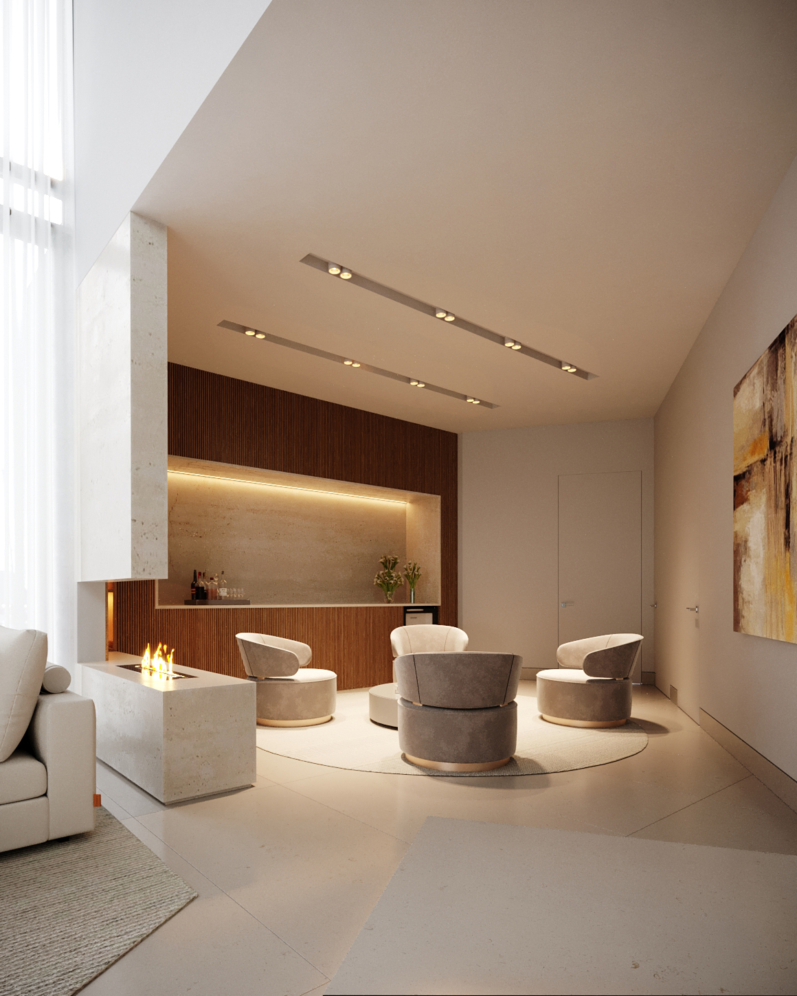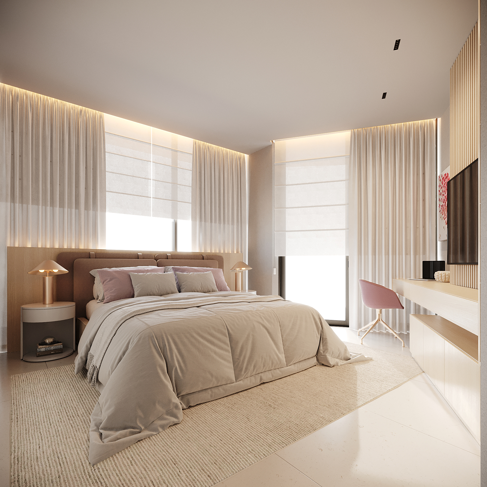 Experience modern living in our integrated living, dining, and family room design. A wooden niche enhances openness, while light tones create a sense of space. Vibrant hues in the family room add a contemporary touch, revitalizing the apartment with modern elegance.