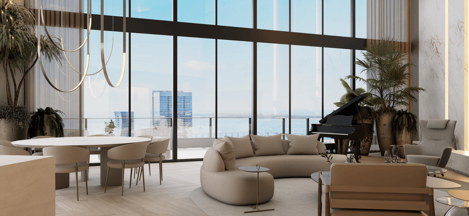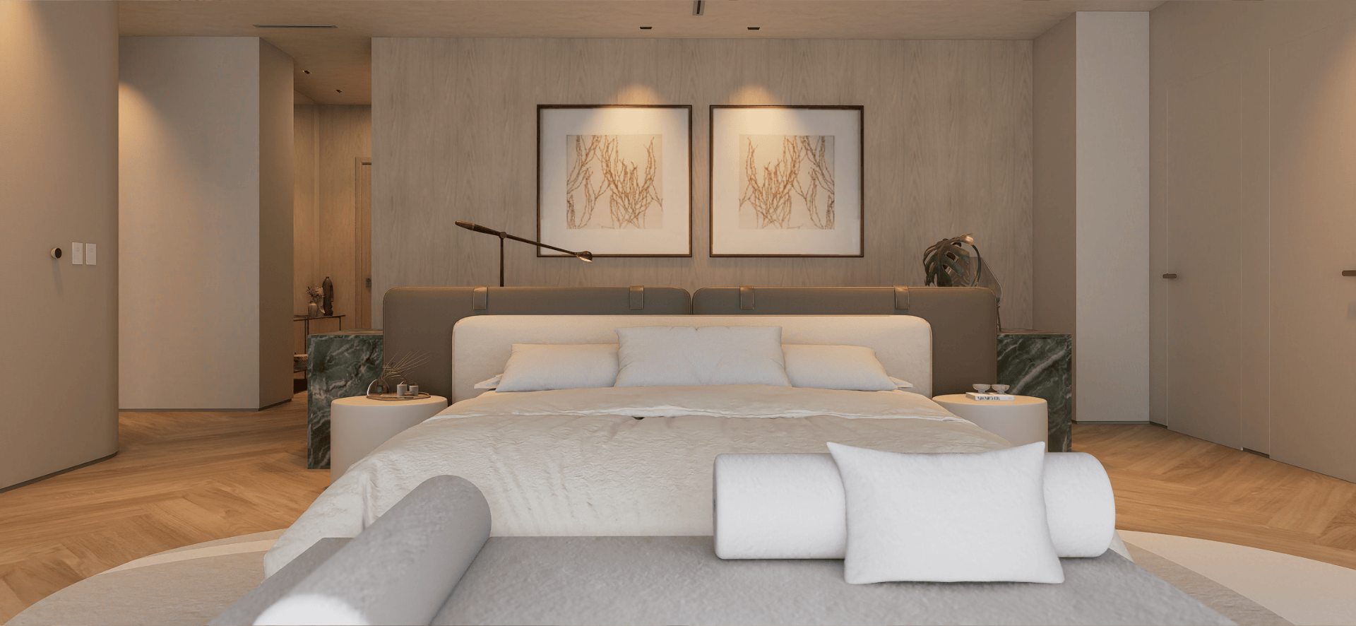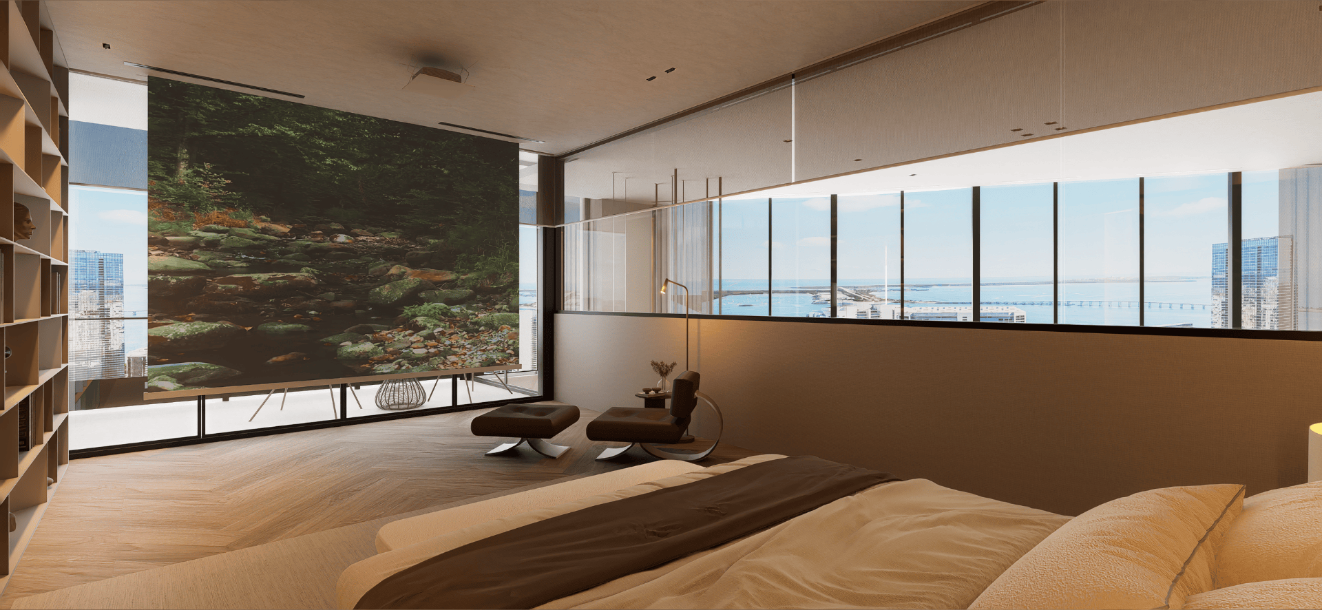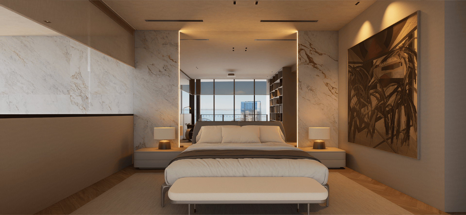This three-story penthouse embodies vertical luxury, with every detail designed to highlight the breathtaking views. A refined palette of dark tones, marble, and rich textures is paired with bold, sculptural furnishings that bring a strong, commanding personality to the space. In the Master Suite, the layout was reoriented so the bed and all furnishings face the floor-to-ceiling glass, making the horizon the main focal point. The top-floor terrace completes the experience with an infinity pool and gourmet area overlooking a dramatic panoramic view, setting a new standard in elevated living.