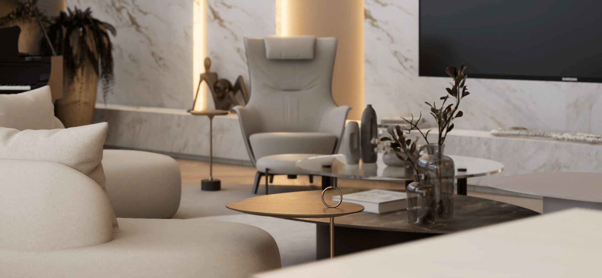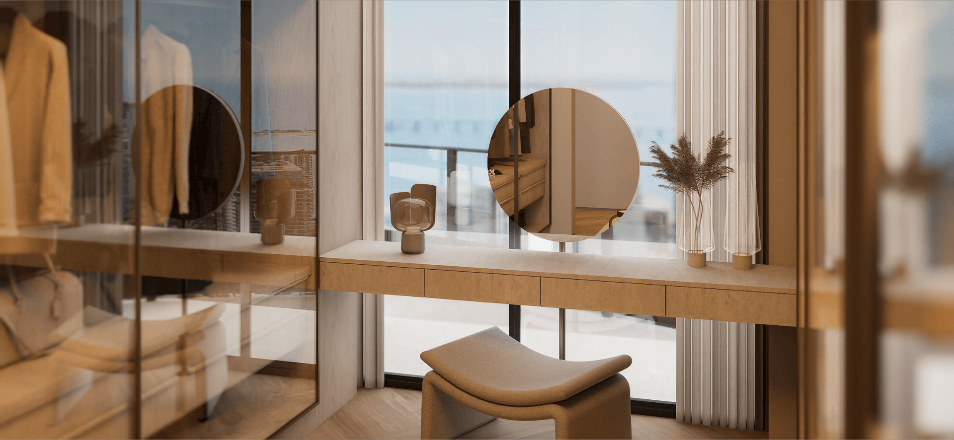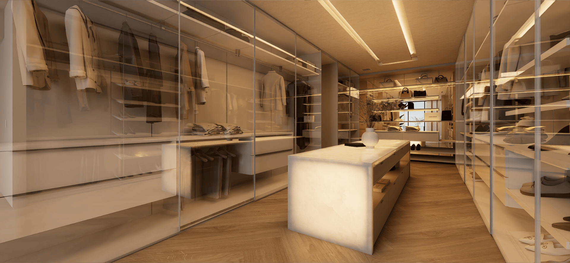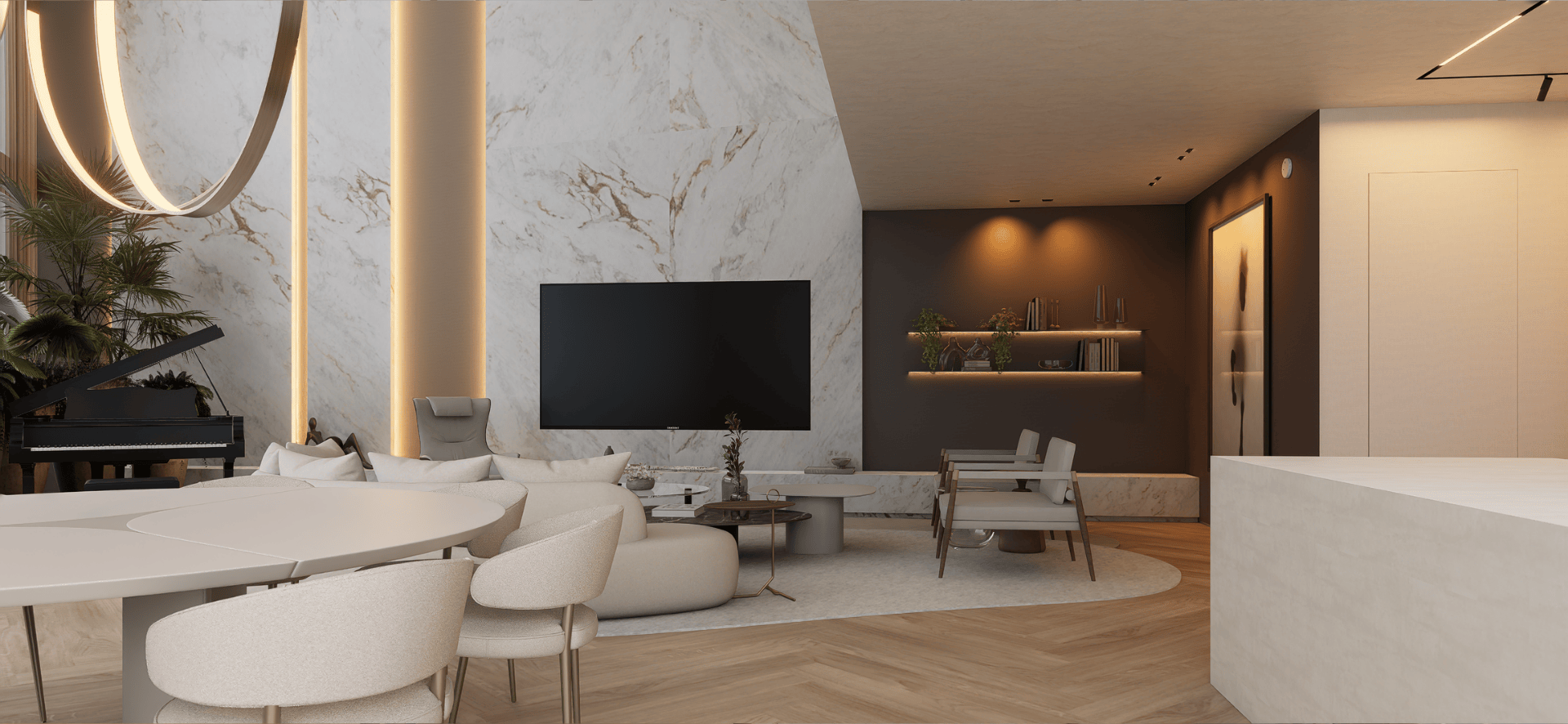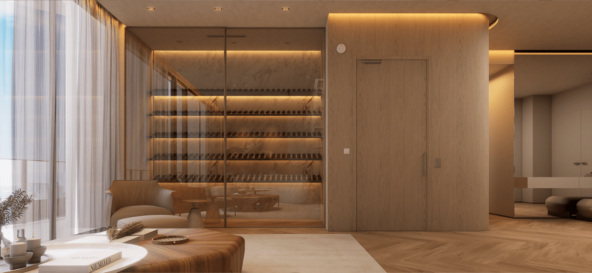 This three-story penthouse embodies vertical luxury, with every detail designed to highlight the breathtaking views. A refined palette of dark tones, marble, and rich textures is paired with bold, sculptural furnishings that bring a strong, commanding personality to the space. In the Master Suite, the layout was reoriented so the bed and all furnishings face the floor-to-ceiling glass, making the horizon the main focal point. The top-floor terrace completes the experience with an infinity pool and gourmet area overlooking a dramatic panoramic view, setting a new standard in elevated living.